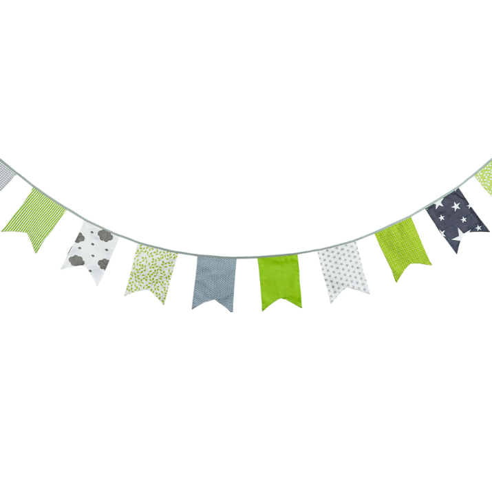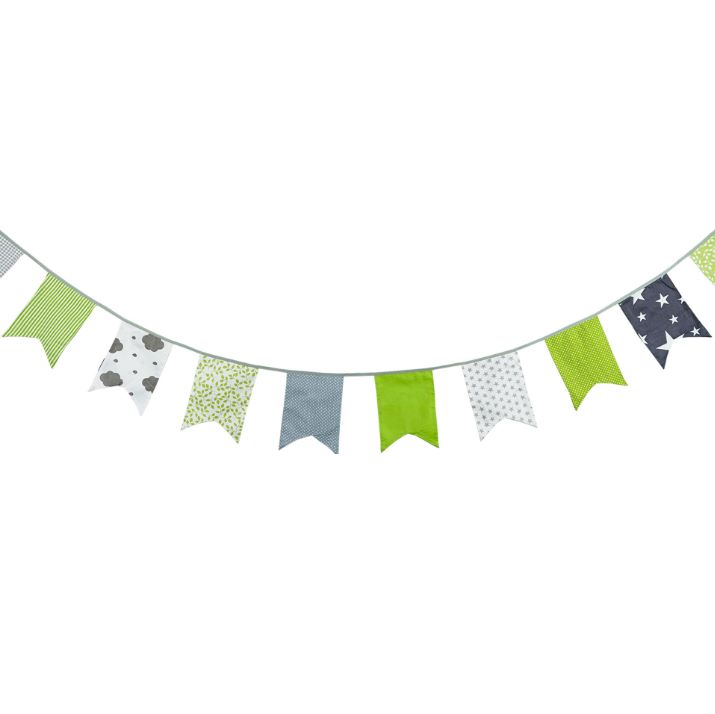 Гирлянда состоит из 12 флажков, общая длина составляет 3,4 м, расстояние между флажками 3 см, длина матерчатых флажков 2,1 м, длина лямок с обеих сторон по 50 см