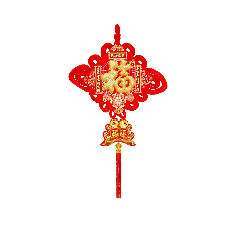Традиционный китайский узел в форме ромба с символичным дизайном. Яркое сочетание красного бархата и золотых элементов создает эффектный акцент в интерьере.