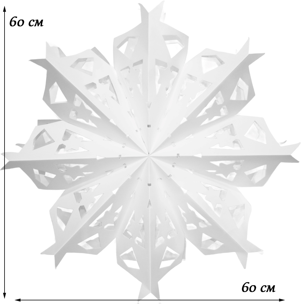 Снежинка на липучках размером 60 см, белого цвета, изготовлена из высококачественной бумаги.